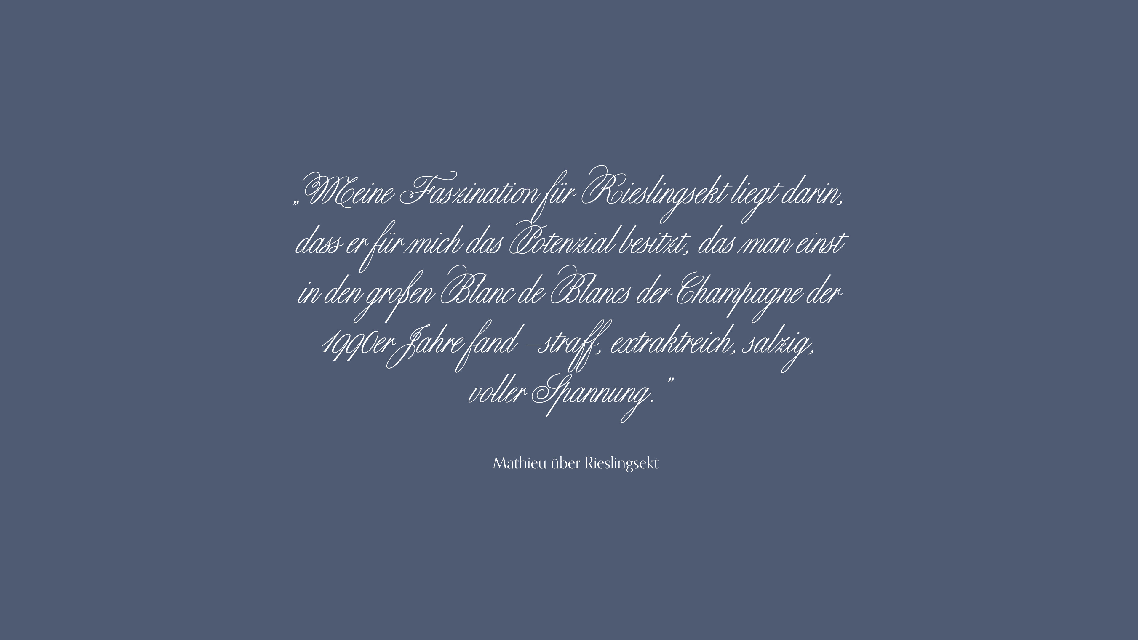 “In Blindverkostungen erinnern mich Rieslingsekte mit ihrer «laserstrahlartigen» Präzision stets an die besten Grand Cru Blanc de Blancs von «Mesnil sur Oger». Mit der Cuvée No. 104 haben wir die perfekte Balance zwischen Frische, Salzigkeit, Extrakt und Schmelz erreicht. Sie beweist (wieder einmal) eindrucksvoll, dass Rieslingsekt definitiv zur besten Schaumwein-Kategorie gehört.”